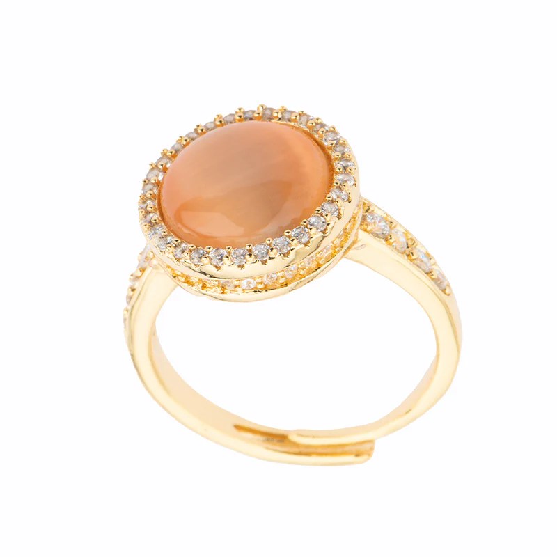 Anello con gambo oro e doppia fila in pavè di zirconi clear con top in cat eye dal taglio rotondo blu/lampone/pesca.