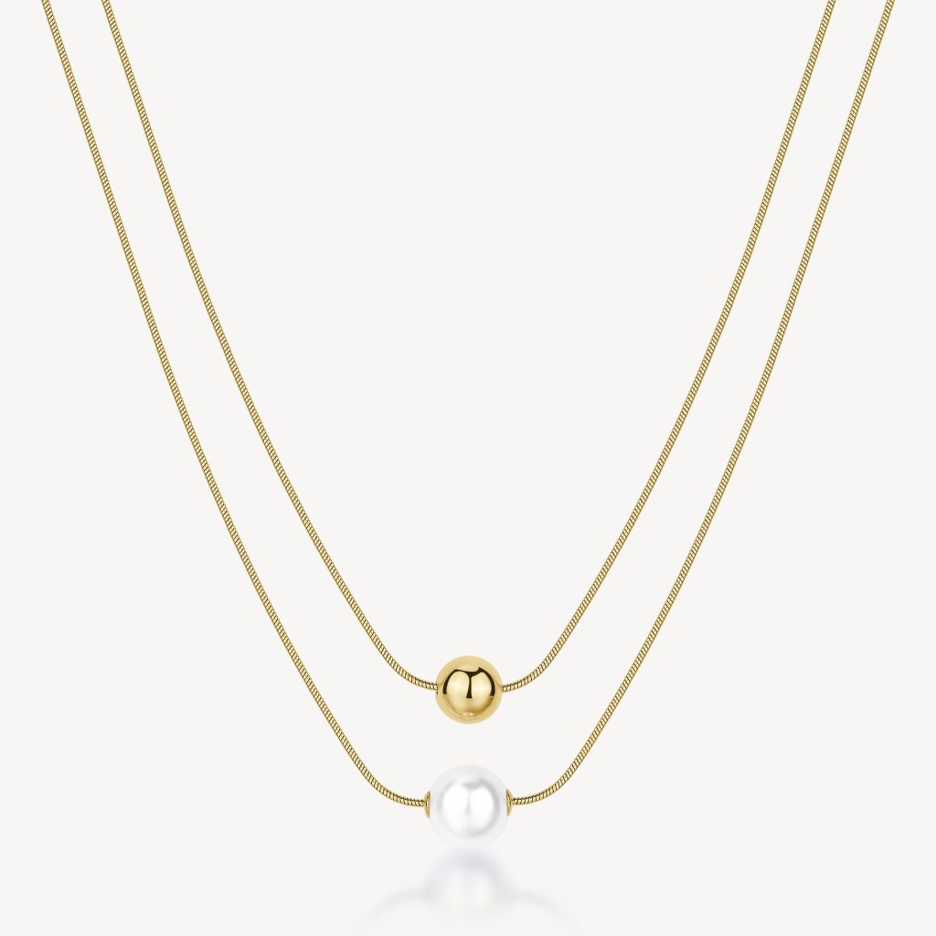 Collana girocollo in acciaio 316L e finitura pvd oro 14K, a doppio filo con pendente a sfera e perla di conchiglia.