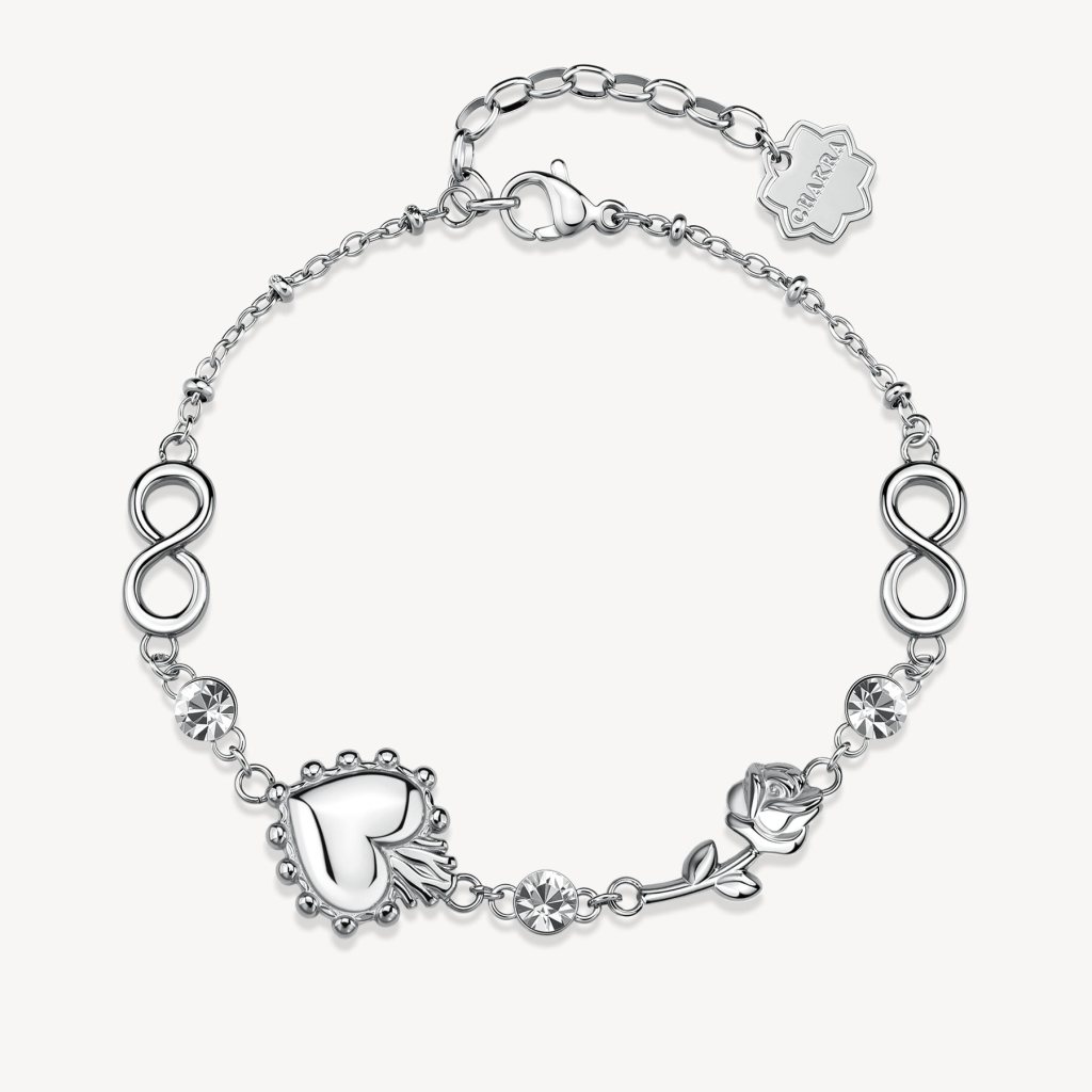 Bracciale in acciaio 316L con cuore, rosa, infinito e cristalli.