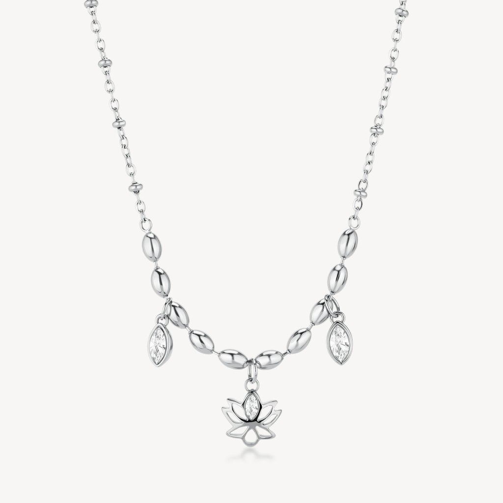 Collana girocollo in acciaio 316L e pendenti con fiore di loto e cristalli.
