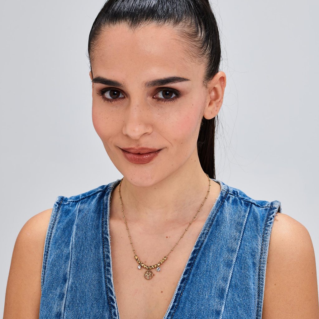 Collana girocollo in acciaio 316L e finitura pvd oro 14K, con pendenti con albero della vita e cristalli.