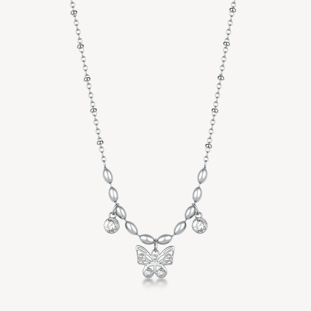 Collana girocollo in acciaio 316L e pendenti con farfalla e cristalli.